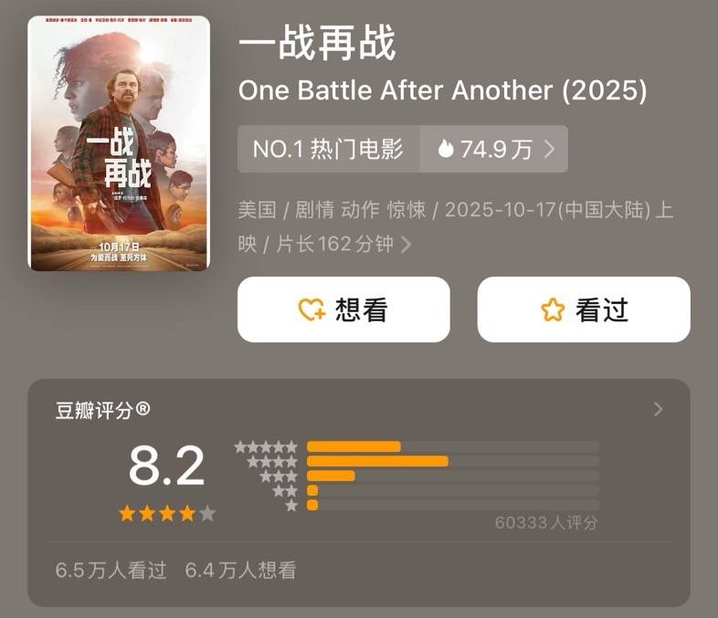 当然,票房并不是终点,《一战再战》后续还有流媒体版权以及海外版权收入。更重要的是,以其强劲的口碑表现,这部电影在颁奖季的表现或许会非常亮眼。
