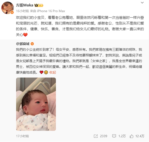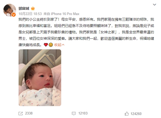 郭富城在微博中难掩激动之情,他写道:“我們的小公主終於到家了!母女平安,感恩所有。”简简单单的几句话,却饱含着对妻子和女儿深深的爱意与感激。他还提到,家里现在拥有三颗璀璨的明珠,自己感到无比幸福和富足。从字里行间,我们仿佛能看到郭富城脸上洋溢着的幸福笑容,那是一种作为父亲的骄傲与满足。