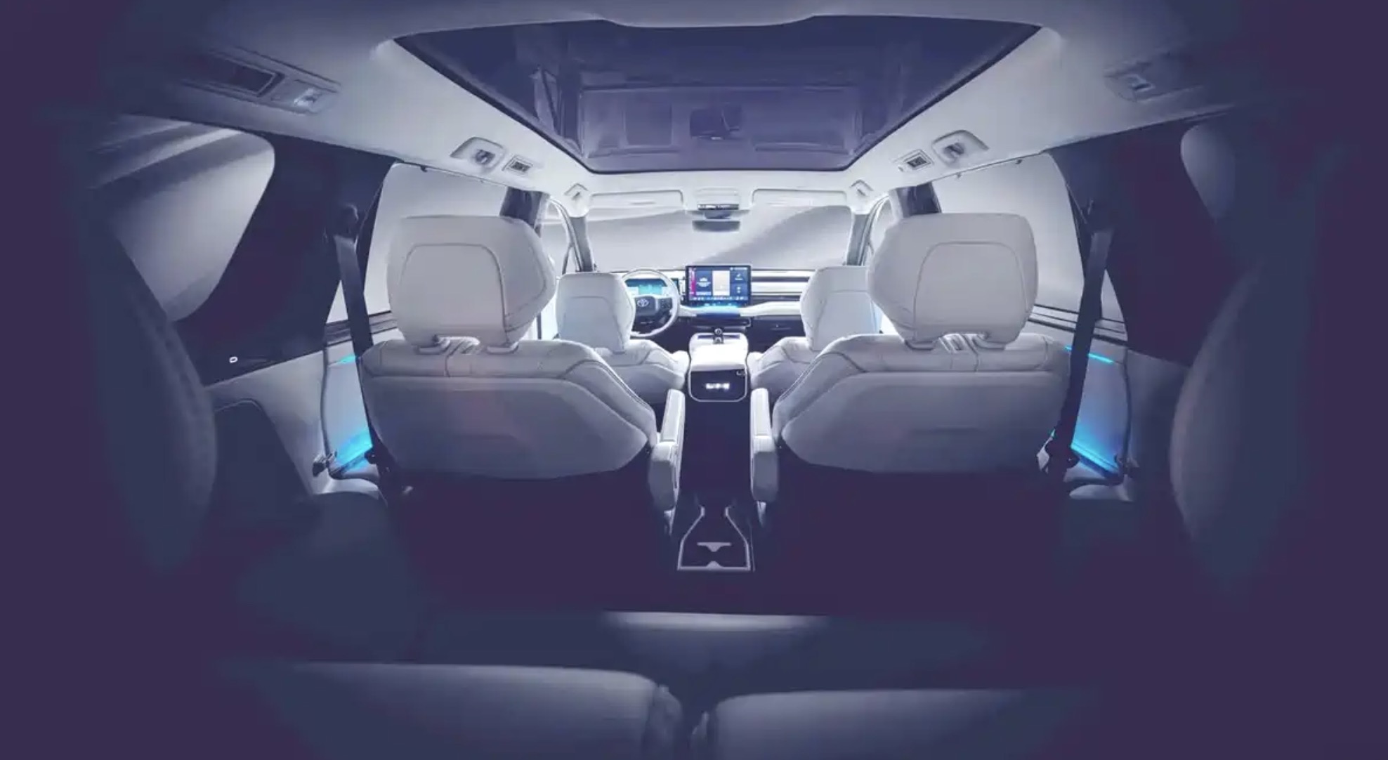 外观上,新车延续bZ Large概念车的设计基因,采用硬朗直线条造型,区别于主流电动车的流线型设计,最大化提升车内空间利用率。前脸保留丰田标志性C字形日间行车灯,搭配贯穿式光带,辨识度拉满,并未彻底取消前格栅,而是保留梯形进气口轮廓,兼顾实用性与家族辨识度。车身侧面配备隐藏式门把手与电子后视镜,搭配内凹腰线与隆起肩线,科技感与力量感兼具。车尾采用贯穿式尾灯并延伸至后翼子板,搭配双色后包围,与前脸设计形成呼应,整体风格沉稳大气。